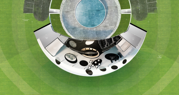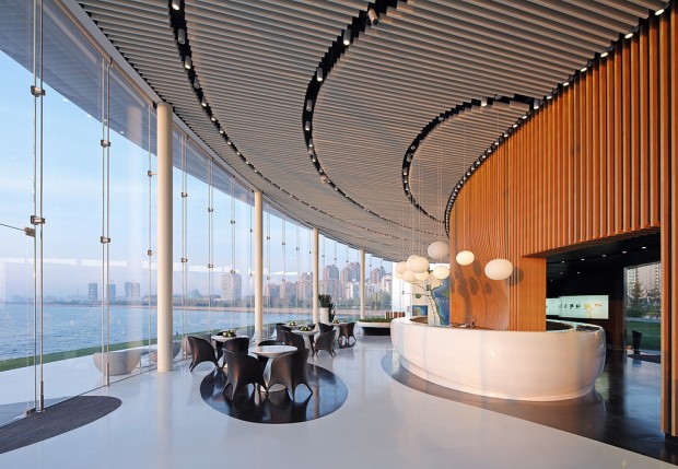 The 6000 square feet structure is the first building to be completed on the island, and is designed to make the most of the popular seafront location. The pavilion provides a reception area and information hub for potential customers of the new development, and will also serve as an event space in the future.